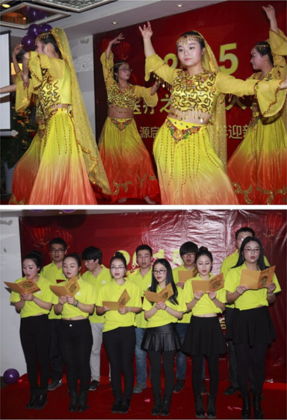 主持人华丽登场。晚会期间,多才多艺的表演纷纷登台亮相,一展源启人的风采。一首斗志昂扬的个人独唱,让年会现场气氛更加活跃。一曲笛子独奏,笛声悠扬;性感热辣的肚皮舞,惊艳四座;一首吉他弹唱,清新文艺;集体共舞小苹果,热情洋溢。实施总监付良军和研发总监曾双共同抽奖,宣布和颁发相关奖品。随后,财务总监吴琼演唱了《春暖花开》,表达了对源启光明前景的信心和美好的祝愿。